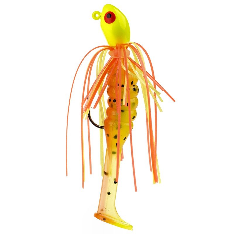 The Crappie Kicker is designed with a spear-shaped head for penetrating through heavy cover and grass with ease and features an Eagle Claw Light Wire Platinum Black Hook. Its spear-shaped head slips through cover like a natural bait fish, and the combination of a hard-kicking Slabalicious body and pulsating micro-skirt says "come get me" in a way no other bait can. Great for spider rigging, casting, and jig trolling. Spear-shaped head slides easily through cover.