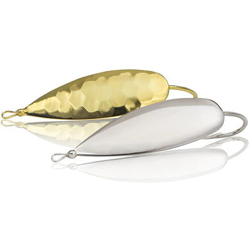 The Bagley Weedless Spoons are the best quality spoons available for the price. Available in several sizes and in a choice of a hammered or mirrored finish. These are genuinely forged spoons that creates a tapered edge and results in an aerodynamic design that allows for long casts and a perfect variable flutter in water. Every Bagley spoon is finished with a genuine gold or silver plating that allows for high flash and great durability - vital in salt water conditions. Each spoon is equipped with a strong, high quality, super sharp hook. Forged in the USA. Fish them with or without a soft plastic trailer and work this wide wobbling spoon in the sea grass or around weeds, right where game fish forage.
