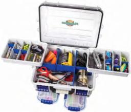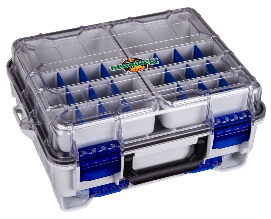 Flambeau Waterproof Satchel: Zerust dividers in each satchel for rust protectionThick wallDurable constructionGlide trays rotate out for easy access to base storage areaRecessed lid.